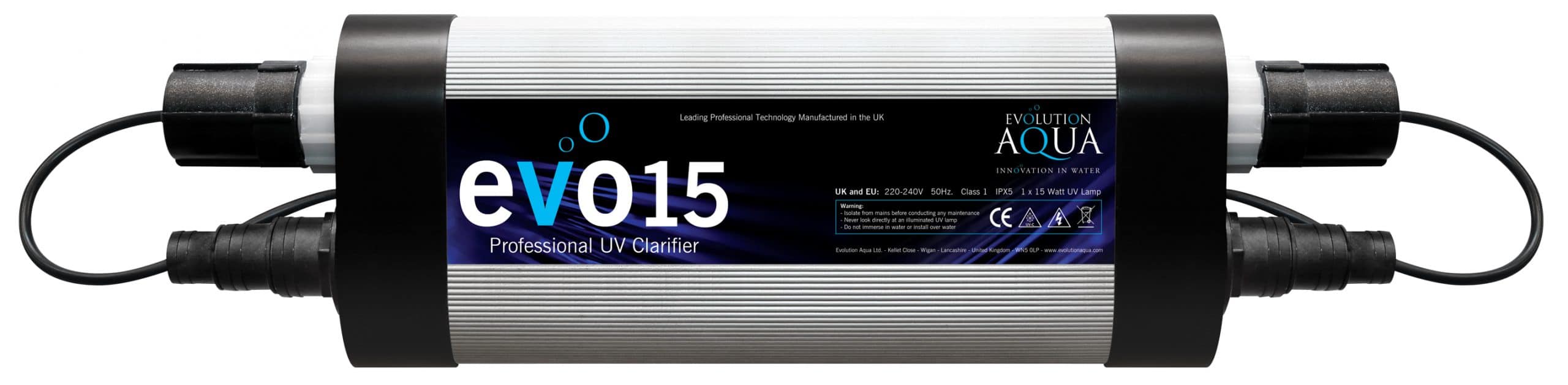 | Evo 15w UV | 15,000L | 7,500 LPH | 15w Bulb | 25/32/38mm | L58cm x W16.7cm x D8.8cm | 2 Years |